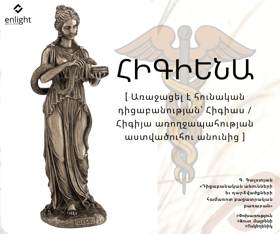 Թե ինչ է հիգիենան, գիտեն բոլորը. այդպես են անվանում առողջության պահպանությունը ապահովող միջացառումների ամբողջությունը: Բայց քչերը գիտեն, որ հայերենում փոխառյալ այս բառը ունի դիցաբանական ծագում: Այն առաջացել է Հիգիասի/Հիգիյայի անունից, որը հունական դիցաբանության մեջ առողջապահության աստվածաուհին է, առասպելական բժիշկ Ասկլեպիոսի դուստրը: Նա դիցաբանության մեջ պատկերված է երիտասարդ կնոջ կերպարանքով՝ հագին սպիտակ պարեգոտ, ապարոշ, օձի հետ, որին կերակրում է պնակից: Ահա թե ինչու մեր օրերում օձի հետ բաժակը դարձել է բժշկության խորհրդանիշը: Այս պատկերին կարելի է հանդիպել բոլոր բուժական հաստատություններում: