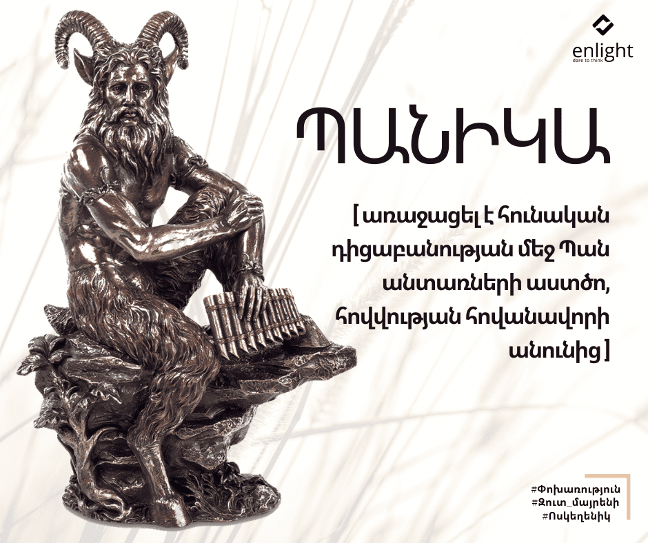 Երբ որևէ արտակարգ բան է պատահում, հաճախ լսում ենք պանիկայի մեջ չընկնելու հորդորներ։ «Պանիկա» բառը հունական ծագում ունի: Նրա հիմքում հունական դիցաբանության մեջ Դրիոպե հավերժահարսի և Հերմեսի որդու՝ Պան աստծո անունն է: Երբ Դրիոպեն Պանին աշխարհ բերեց, սարսափեց որդու ոչ մարդկային կերպարանքից և զարհուրած փախավ. Պանը ծնվել էր այծի ոտքերով ու եղջյուրներով, երկար մորուքով: Նա ապրում էր անտառներում ու լեռներում, հովվություն էր անում ու սրինգ նվագում: Սակայն Պանը նաև պոռթկացող խառնվածք ուներ: Ցասման մեջ նա ունակ էր ծանր ու տանջալից երազներ ուղարկել: Կեսօրվա շոգին հանգստանում էր անտառի թավուտներում, և երբ համարձակվում էին նրա հանգիստը խաթարել, անսպասելի հայտնվելով՝ նա այնպիսի՜ սոսկում էր առաջացնում, որ ճամփորդները գլխապատառ փախուստի էին դիմում: