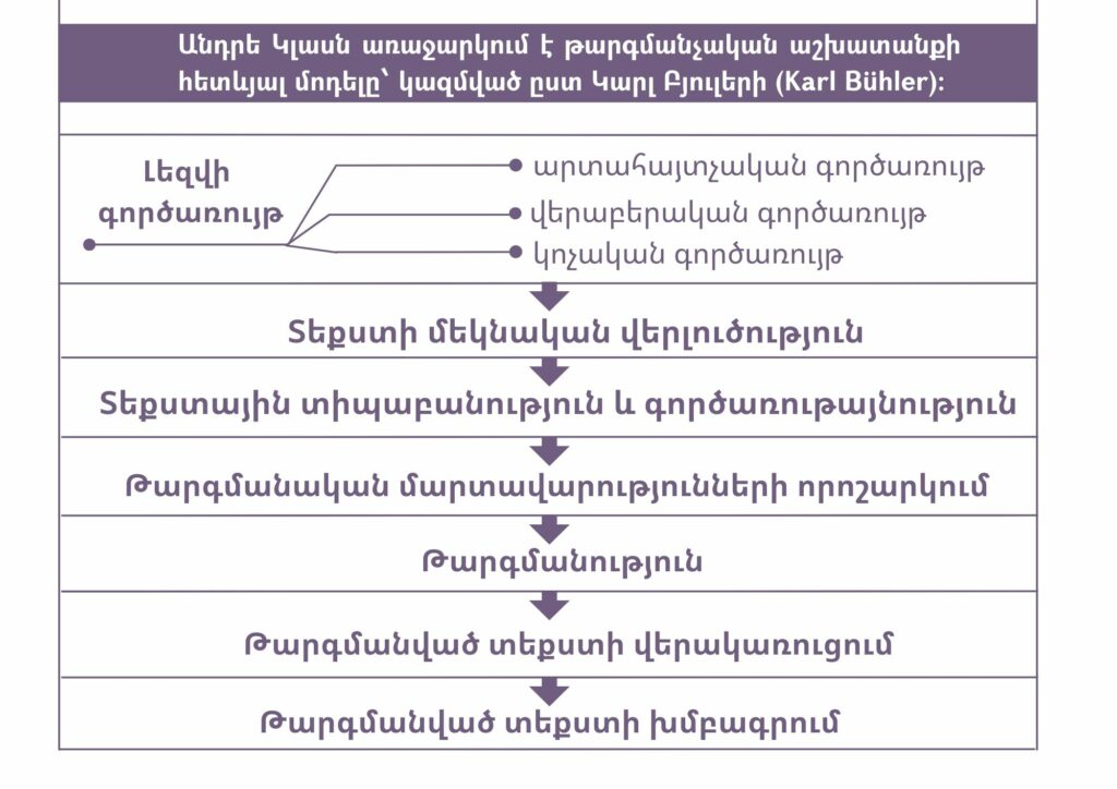 Անդրե Կլասն առաջարկում է թարգմանչական աշխատանքի հետևյալ մոդելը՝ կազմված ըստ Կարլ Բյուլերի (Karl Bühler), որի միջոցով կփորձենք վեր հանել խնդրո առարկա թարգմանության գործընթացի հետ կապված որոշ կետեր։