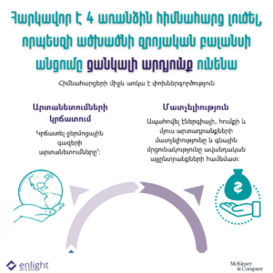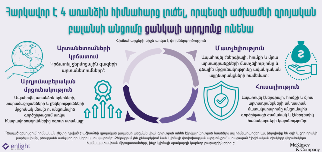 Ածխածնի արտանետումները նվազագույնի՝ զրոյական բալանսի հասցնելը շատ հաճախ դիտվում է որպես առանձին խնդիր։ Իրականում, այն չորս փոխկապակցված մարտահրավերների ամբողջություն է։ Անցումային գործընթացի հիմքում իրապես ընկած է ջերմոցային գազերի արտանետումների կրճատումը։ Սակայն, եթե այս անցումը ամբողջապես չիրականացվի, այն կարող է վտանգել 3 կարևոր հիմնահարցերի լուծումը` մատչելիություն, հուսալիություն, արդյունաբերական մրցունակություն։